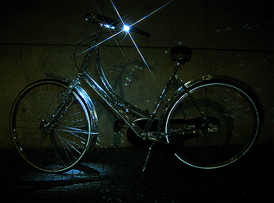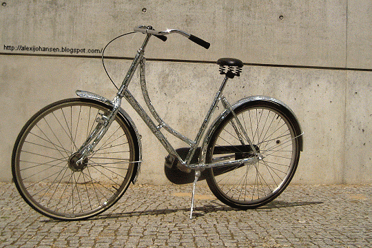 And last night, Alexi Johansen, Son of Techno Viking, came by Pinky's Peepshow to see Lorelei Vanora sing, and brought his mirror-ball-mirrored Disco Bike with him. The LEDs in the handlebars make it a sight to behold at night. I'm looking forward to him posting some nighttime footage of it that will do it justice, but in the meantime, here's a nighttime photo and some daytime footage: